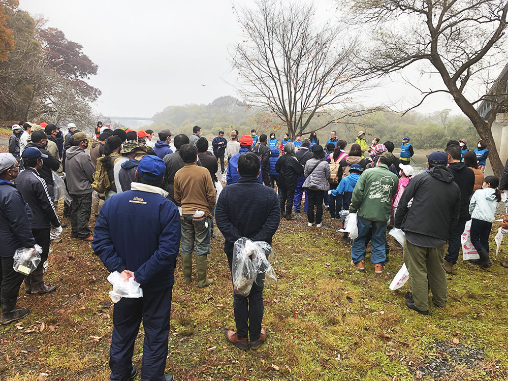 春(4月)・秋(11月)の年2回、河川敷に流れ着いたゴミを拾う清掃活動を行っています。